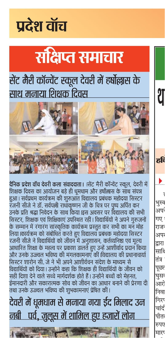 सेंट मैरी कॉन्वेंट स्कूल देवरी में हर्षोल्लास के साथ मनाया शिक्षक दिवस