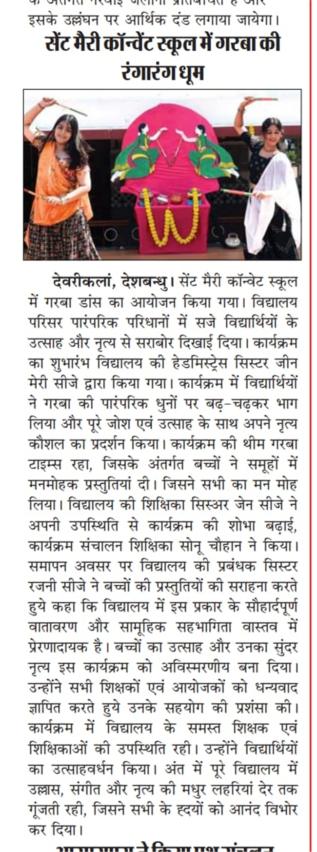 सेंट मैरीज़ कॉन्वेंट स्कूल, देवरी में गरबा उत्सव बड़े ही हर्षोल्लास और पारंपरिक अंदाज़ में मनाया गया। विद्यार्थियों ने रंग-बिरंगे परिधानों में नृत्य कर कार्यक्रम की शोभा बढ़ाई।
